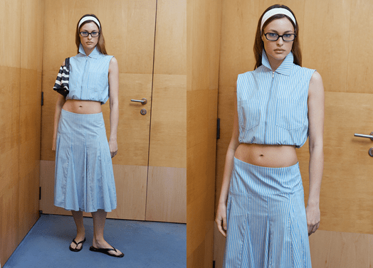 The collection supports this concept through lightweight silhouettes and defined volumes. Balloon trousers, fluid skirts and relaxed denim are paired with striped sets and structured tops, particularly in halter cuts. Delicate fabrics, subtle sheerness and touches of shine add contrast, while blazers and trench coats in neutral tones reinterpret tailoring in a contemporary way. Bags, sunglasses and scarves complete a versatile and modern proposal.